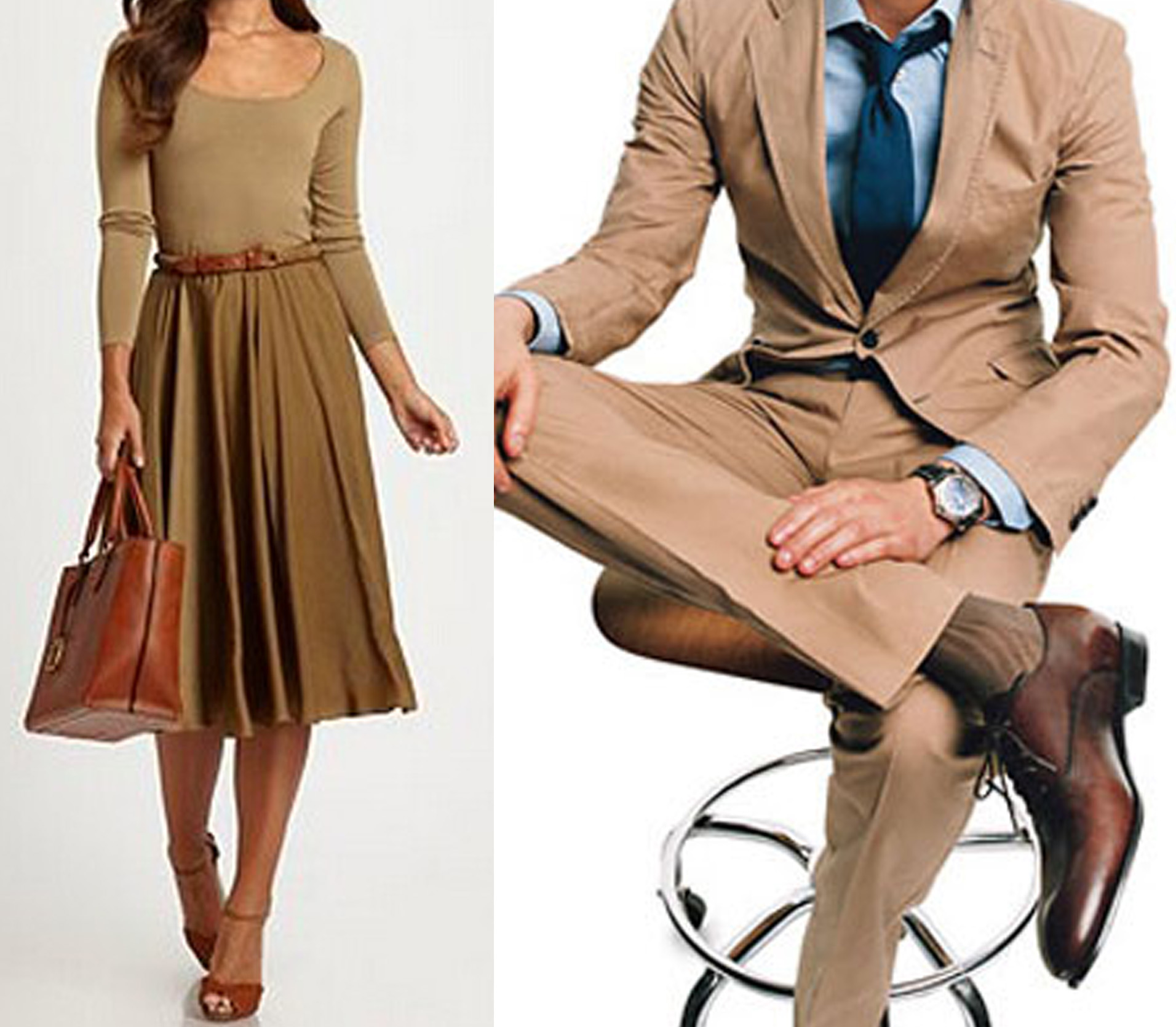 Combinações monocromáticas ou tom sobre tom criam uma ilusão de unidade no visual. Complemente com o uso de meias, cinto e sapatos em tom igual ou semelhante.