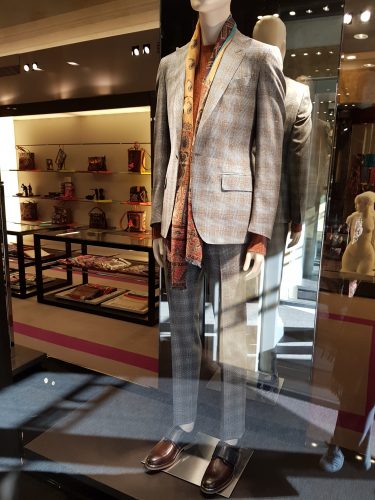 Em recente viagem à Italia, mais precisamente em outubro último, fotografei este terno, maravilhoso, em tons de marrom, que estava na vitrine da loja Etro, em Florença. Não fiz mais fotos porque fotografar vitrines é proibido no hemisfério norte e os seguranças das lojas estão sempre de olho.